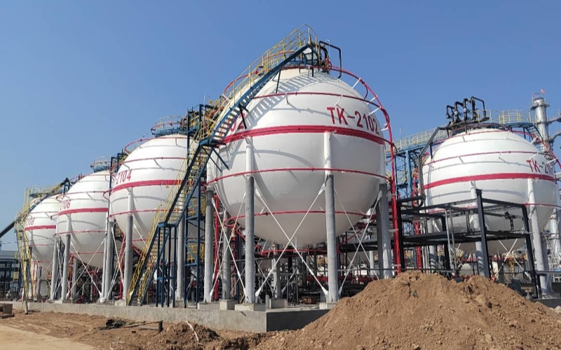球罐是生產實際中應用比較廣泛的壓力容器。與圓筒形儲罐相比,球罐的優點 是:當二者容積相同時,其表面積最??;當壓力和直徑相同時,其壁厚僅為圓筒形罐的 一半左右;當直徑和壁厚相同時,其承壓能力約為圓筒形罐的兩倍,因而它可大量節 省鋼材,減少占地面積,適于制造中壓容器。但另一方面,球罐殼體為雙向曲面,現場 組裝比較困難,勞動條件差,對焊工的技術要求高,制造成本高。球罐主要用于儲存液化石油氣、丙烷、丙烯、丁烯及其他低沸點石油化工原料和 產品。在煉油廠、石油化工廠、城市燃氣供應部門都有廣泛應用。