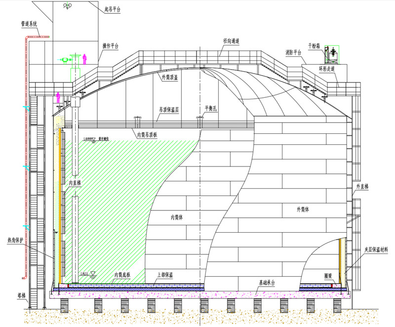雙層金屬壁、平底、內懸頂、外拱頂、立式圓筒、全包容結構,由主容器、次容器、熱角保護層、底部絕熱、夾層絕熱(或外部保溫)、吊頂絕熱、儲罐頂部鋼結構、塔梯、設備閥門、電氣儀表及基礎平臺等組成。